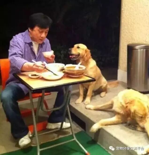 成龙大哥和它们一起吃饭,虽说粗茶淡饭的。但大金毛则在一旁看着,也是馋的不要不要的啊~