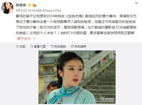 2016年,孙菲菲在微博爆料,说自己在拍《血色恋情》的时候,被剧组暴打,还爆料当地政府也参与了,不过相关人员现在已经落马。