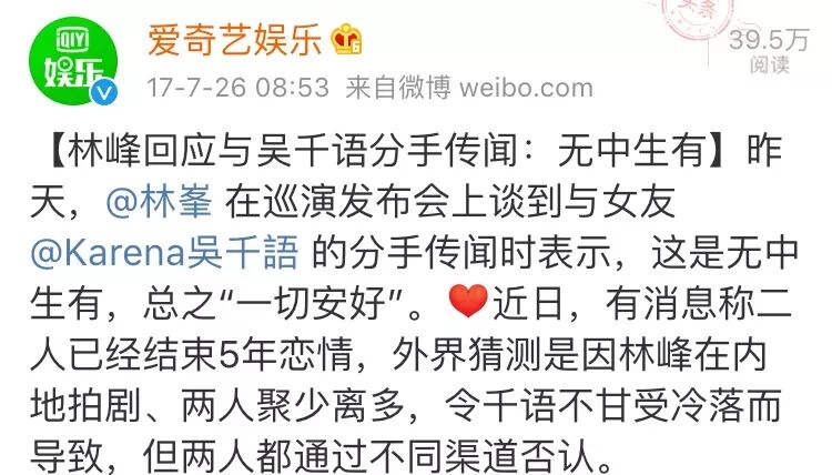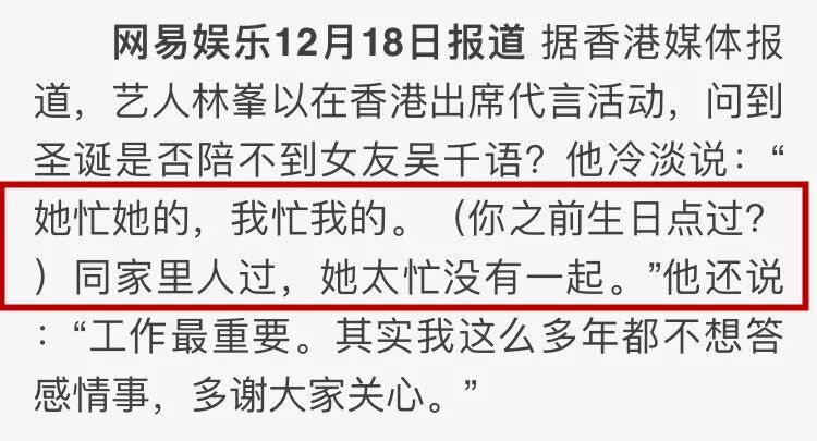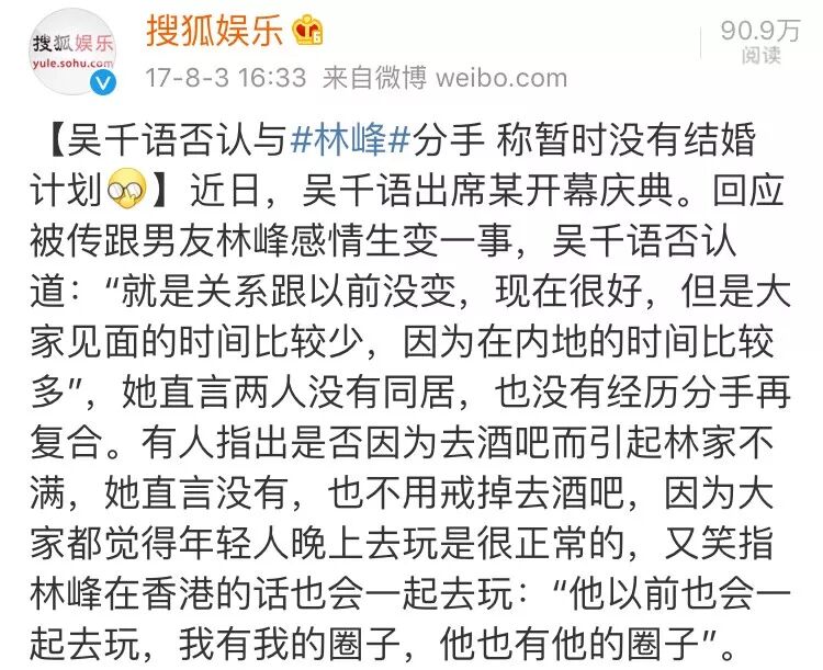 要知道之前传了N次分手,每一次不是林峯就是吴千语借着媒体采访的机会坚决否认。