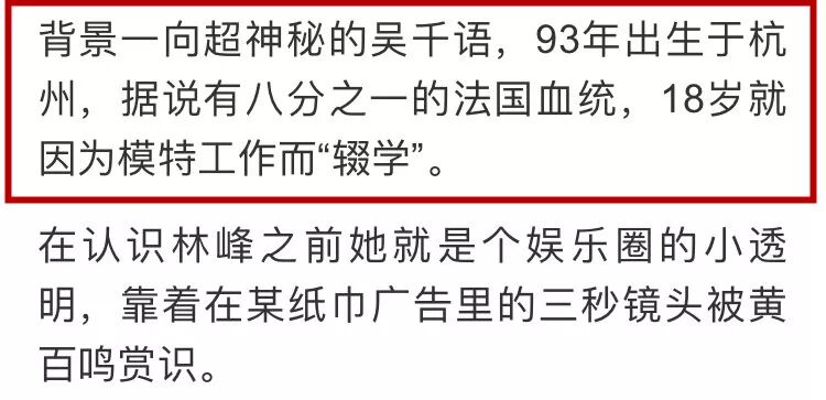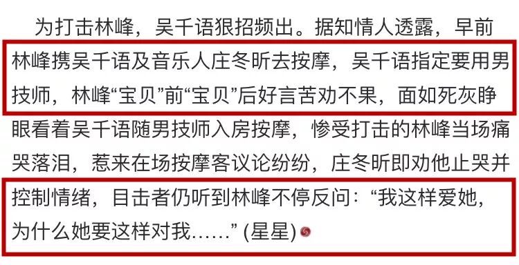 动不动就给林峯使个性子打击打击他,比如这种林峯因为吴千语要男技师按摩当场痛哭的奇葩新闻。