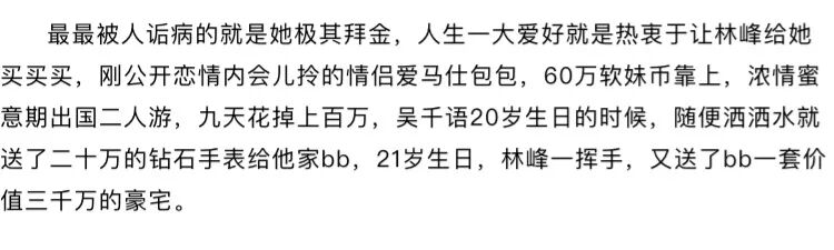 大多数人都觉得林峯在心甘情愿为小女友付出一切,吴千语只是在索取和利用林峯,emmmmmmm都是马后炮了。