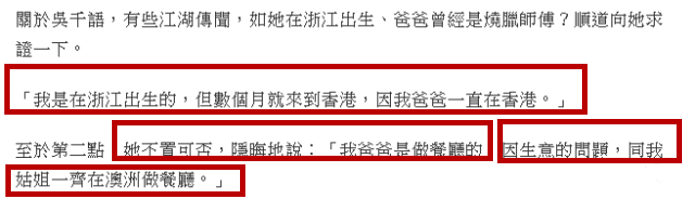 因为在香港出道,所以吴千语自称是地道的香港人,中法澳三国混血,父亲在澳洲做餐厅生意,她在澳洲留学。