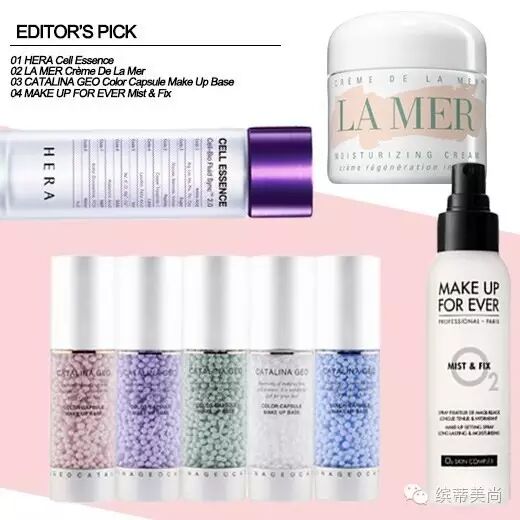 04 玫珂菲(MAKE UP FOR EVER)Mist & Fix:该产品质地轻盈、舒适,透明质定妆水可固定一整天的妆容。化妆前后各一次,还可起到补水保湿及持久定妆的效果。尹智慧 郑文兰/文 LAMY/CATALINA GEO,HERA,LA MER,MAKE UP FOR EVER,bnt新闻DB/www.lamy.co.kr,www.catalinageo.com