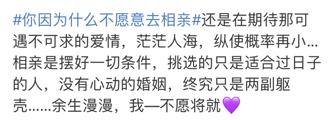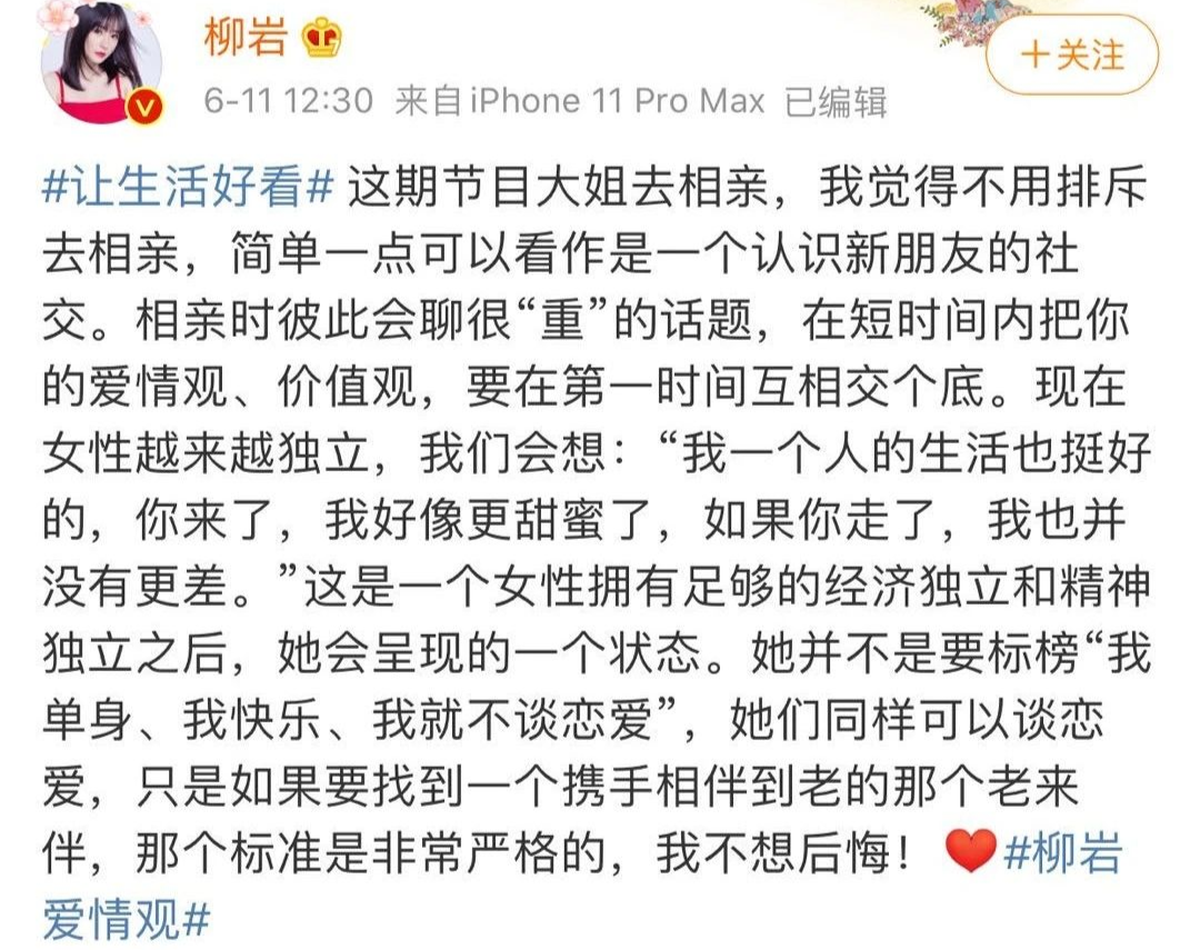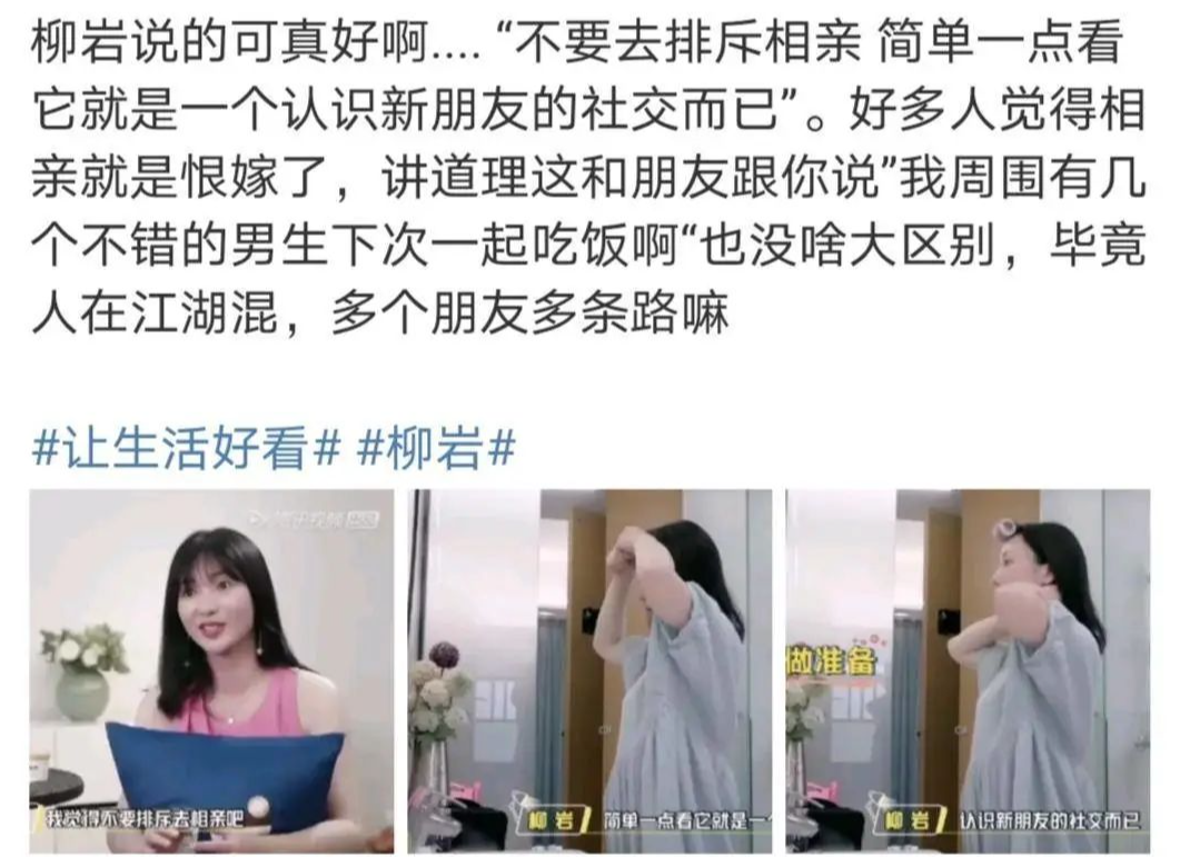 柳岩40岁,又去相亲了 槽值 内地女星 2020-06-22 12:37:35 244 创作不易,用心坚持,欢迎请BaGua喝几杯爱心咖啡!打赏并支持本文 打赏并删除本文 世上奇葩千千万,相亲对象占一半。越来越多的年轻人,如今迈入了相亲行列。某婚恋平台2019年调查数据显示,有40%的95后,已经有了相亲体验。小学到高中,父母老师告诫我们不要早恋;大学到毕业,忙着学习玩闹没顾上谈恋爱;工作之后,更是没了时间轰轰烈烈爱一场;到了适婚年龄,亲戚朋友不断催促,禁不住想说早干嘛去了。幸好全国亲戚大都一样,总能热情张罗着介绍,让我们有机会通过相亲认识另一个人。前段时间,微博一个吐槽贴火了。评论区里,很多女生分享了她们遇到过的,奇葩又搞笑的相亲对象。有一见面就让你背《岳阳楼记》的;有斥巨资为你的QQ名片充赞的。全面开启相亲模式的成年人,在饭局上又多了一项主题:吐槽相亲。没和朋友在饭桌上抱怨过相亲,似乎不足以谈人生。一天相两次亲的柳岩成年人总在吐槽,相亲这道致命符,不经意就盯上自己。即使是柳岩,也没有逃过被安排的命运。一安排,一天就是两个。不算缺钱,事业稳定,相貌显然也不错。一天相两次亲的行为,放在柳岩身上,多少让人觉得有一些不可思议。换做其他人,被安排这样的相亲局,大概会直接摆摆手拒绝。但被大嫂一口气安排了两个相亲局之后,柳岩的表现,是期待又紧张。见面之前,单单是穿衣服,就纠结了老半天。可爱和性感的风格挨个试了一遍。化妆、护肤,所有变美的步骤一个不落。相亲结束之后,还会反思自己的表现,对相亲对象也有认真的评价。足够看出她对这次相亲的重视。单身三年的柳岩,把“想谈恋爱”四个字写在了脸上。社交方式虽然有很多,世界小得好像只在咫尺,可疏于交流的人们,又仿佛远在天边。身边朋友、同事局限在一个或几个圈子里,关系范围狭窄,很难有什么新的契机。相亲对她来说,是发展恋爱对象很好的机会,也是扩大社交圈的方法之一:“我觉得不用排斥去相亲,简单一点,一个认识新朋友的社交。”但她对于相亲的积极态度,却并不被理解。有网友吐槽她的年龄,40岁了,还在相亲。当年过30岁的女明星们,大多以“我不恨嫁,关你p事”的态度看待自己的婚姻时,柳岩的举动,在一些网友看来,就显得有点“饥不择食”:部分网友的不友好评论 / 微博但平心而论,相亲,值得被嘲吗?谈“相亲”色变的年轻人们我发现,“相亲”这个词,在很多人心里有天然的贬义。学者项飙在《十三邀》中,谈到自己其实不太理解,为什么如今城市里,各个相亲角都开始兴盛热闹。因为在几代人的观念里,要靠父母来安排对象,都是非常”掉价“的。主动要求相亲,那是“不可思议”“疯了”的表现。提起相亲,先不问对象是谁、条件是什么,必定先炸毛。年轻人们之间也经常开这样的玩笑:还没结婚吧?给你介绍个相亲?等来的回答,大多是慌张且果断的否认三连:“我不要、别安排我、放过我吧”在综艺节目上,王俊凯和杨紫都不止一次地被前辈们拿相亲开玩笑。所以看到柳岩去见相亲对象的画面,不少人的第一反应是:“柳岩怎么会‘沦落’到要相亲?“必须承认,柳岩这么积极对待相亲的人,不多见。人们默认会参加相亲的人,是条件不大优秀的单身青年。而接受相亲,就意味着承认自己“没有吸引力”:必须通过他人的介绍,才能有机会与异性接触。相亲就像一场明码标价,把自己像商品一样任人挑选,无异于一场自我羞辱。 在我们的文化当中,女性被期待是被动接受恋爱的一方。比如希望“被追”。比如觉得女孩子不能先表白,否则会不被珍惜等等。参加相亲,则显得太过主动积极。当这种相亲遇上年轻人对“命中注定真爱”的丰满想象,也变得更让人难以接受。毕竟,在对爱情故事的描绘里,就算没有drama的一见钟情,也大多是充满偶然和浪漫的。落水人工呼吸,就是相遇的开始 / 《你是我的命中注定》非自然恋爱并不符合大家对于完美爱情的相信,而在相亲之中的相互端详和考量也被认作是一种交易和“现实”。如果说年轻人的婚恋途径中存在着一条鄙视链,毫无疑问,相亲在这个鄙视链中的最底端。人们对相亲避之不及。但事实上,很多人对相亲误会太大。 相亲,值得嘲吗?相亲这件事会让人觉得抗拒和头大吗?或许会。当你享受目前的状态,对于独立和单身觉得舒适时,耳边却总有些闲言碎语说:“赶紧的,女人过了XX岁,就不值钱了。”“不结婚,就是失败。”这样的情况会让人觉得格外反感。那些嘲笑去相亲的人,你很难不从他们的表达中,看出他们的优越感:通过“配对”方式得来的恋爱,看起来像是带着强烈目的性去完成的任务。但相亲又不是完全非黑即白的存在。同样存在着一部分人,承认自己对于恋爱的渴望。比如柳岩:“单身三年,渴望恋爱。”“单身三年了,迫切地想谈恋爱。”或许也能从过往的经历和遗憾中,推断出柳岩渴望的原因。父亲早逝,柳岩没有能够来得及实现他的愿望:让父亲在自己的婚礼上穿一次西装。十几岁在外漂泊,为了给妈妈筹集医疗费,误打误撞进了娱乐圈。咬牙坚持了很多年,但归根到底心底里,还是渴望被人疼爱和照顾。选择相亲,是她自己的权利。期待被爱的柳岩,可能只是无数单身群体的缩影。据国家民政局调查数据:2019年全国单身人口达两亿。其中,90后占比47.68%,80后人群占比41.62%,70后人群占比10