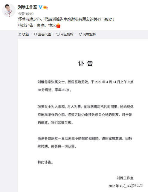 4月14日,刘维工作室第一时间发布讣告,对外宣告刘维母亲病逝消息,年仅63岁,刘维患癌母亲与癌症抗争多年,刘维母亲弥留之际感谢外界对她的关系,由于特殊时期丧事一切从简。