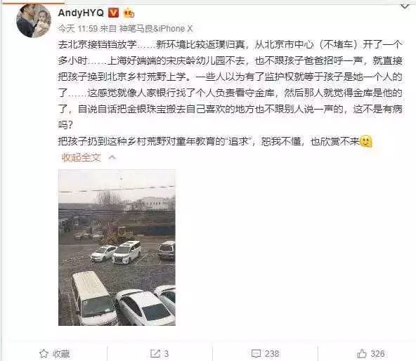 就在今天中午11:59分的时候黄毅清一句话又一次引起了广大网络的舆论和关注,黄毅清前夫黄毅清写到:“去北京接铛铛放学……新环境比较返璞归真,从北京市中心(不堵车)开了一个多小时……上海好端端的宋庆龄幼儿园不去,也不跟孩子爸爸招呼一声,就直接把孩子换到北京乡村荒野上学。一些人以为有了监护权就等于孩子是她一个人的了……这感觉就像人家银行找了个人负责看守金库,然后那人就觉得金库是他的了,自说自话把金银珠宝搬去自己喜欢的地方也不跟别人说一声的,这不是有病吗?