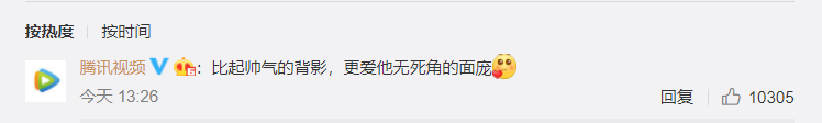 而最为关键的是“腾讯视频”还在下面评论了一句话,“比起帅气的背影,更爱他无死角的面庞”。