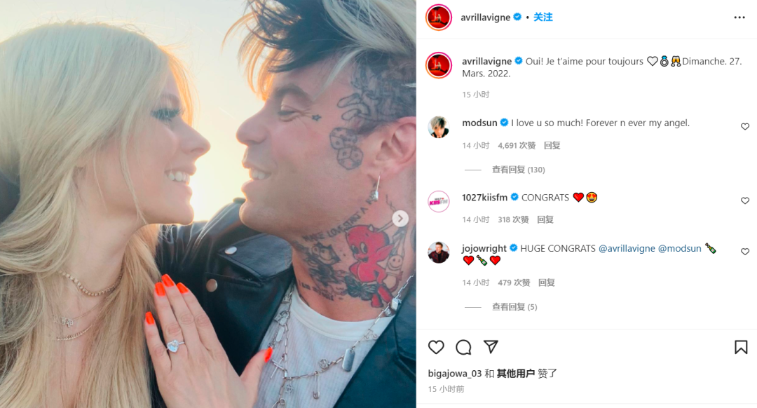 就在4月9日昨天,小天后艾薇儿(Avril Lavigne)在自己的社交媒体上官宣了自己与摇滚歌手男友Mod Sun的订婚消息,无名指上的心形钻戒格外抢眼。