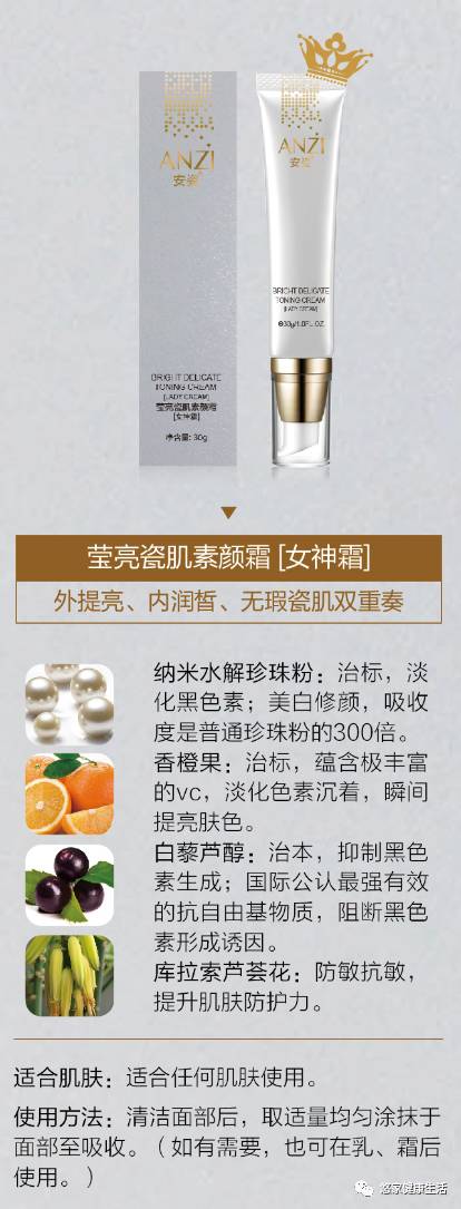 长效养白:长期使用安姿女神霜,美白养肤精华滋养肌底,分解黑色素,阻隔黑色素生成诱因,肌肤由内而外,水润透白。