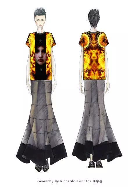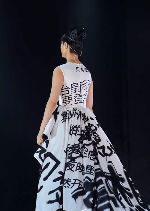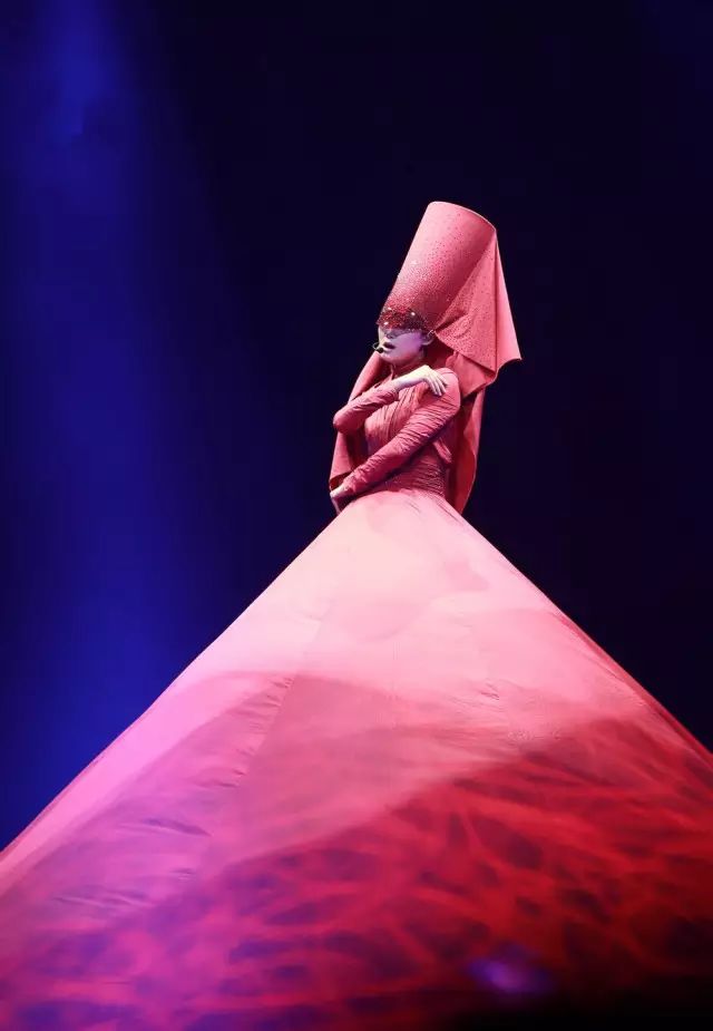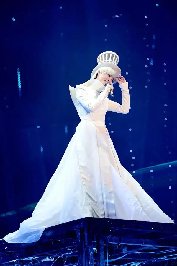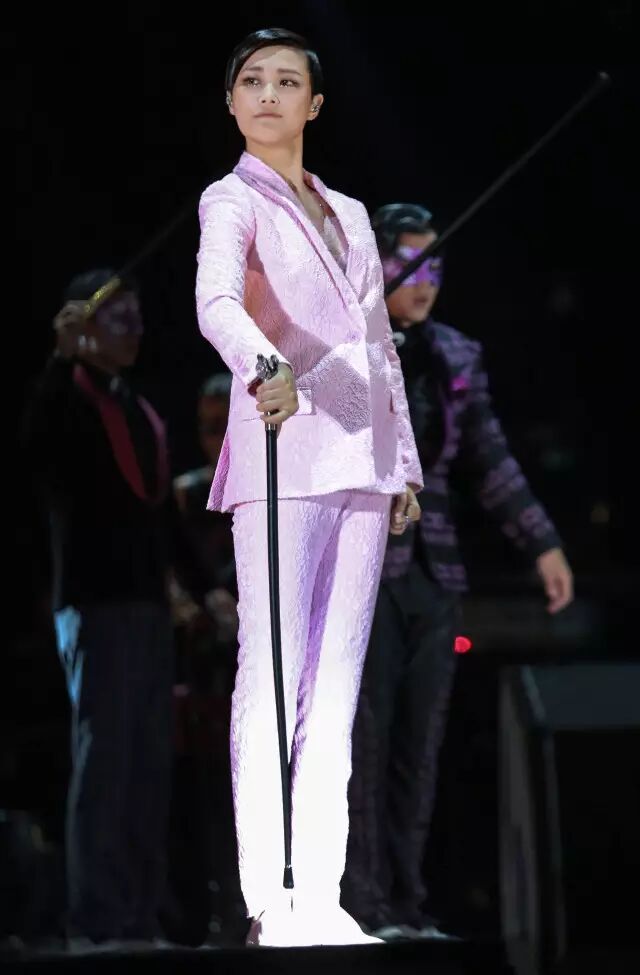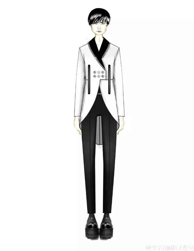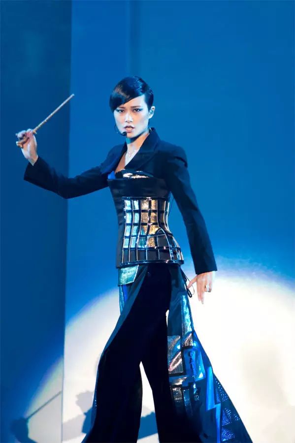 金色褶皱荷叶边修饰披风,搭配以金色提花西服,亮粉色衬衫,以及金色提花领带,象牙色礼帽,金色乐福鞋的点缀,充满了华丽复古的舞台魅力。