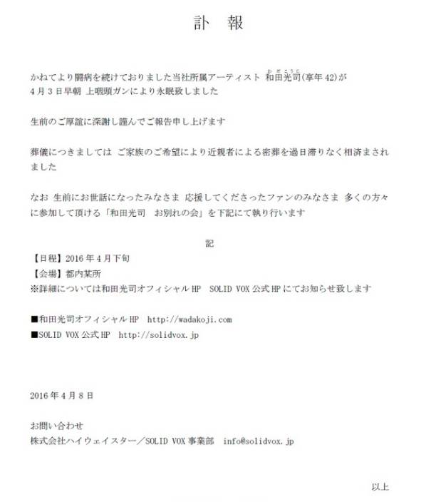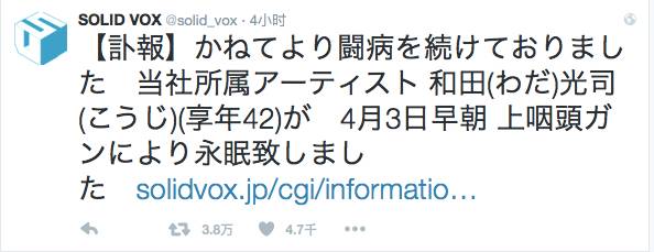 根据SOLID VOX的推特消息,隶属于当事务所的演唱过「数码宝贝」主题曲的和田光司于4月3日早上因癌症去世,并且发布了官方讣告,宣告其短暂的42年生命就此终结。
