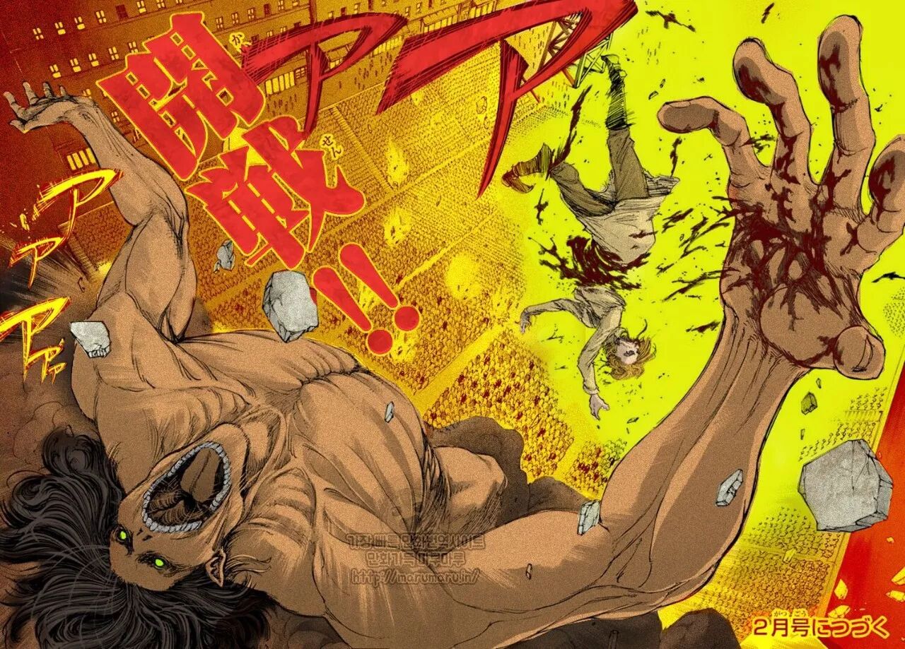 来到第100话,整个故事走了一个大圆,又回到了【那一天,人类回想起了被巨人支配的恐惧……】,然而一切又都已经回不去了,历史的潮流,裹着宿命的连锁,滚滚向前。看着如今长发胡渣的艾伦.耶格尔,无尽唏嘘。早前一直流传,巨人将用100话完结,如今则还有很多未竟之事,而从这原本的终点开始,《进击的巨人》也将正式走向伟大,彪炳史册……