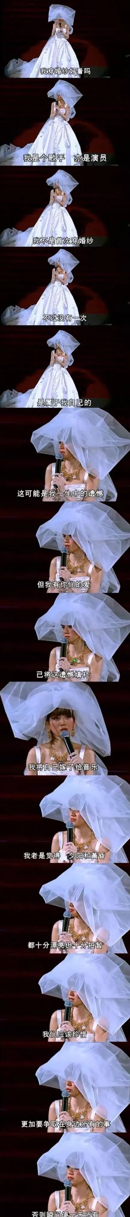 2003年11月15日,香港红磡体育馆,40岁的她站在舞台中央,为自己掀起头纱,说出下面这段话时,泪水在眼眶打转。