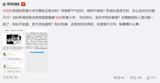 对于诈捐一事工作室虽然发表了声明,但是大众对于井柏然希望小学一事可能还没有很清楚。