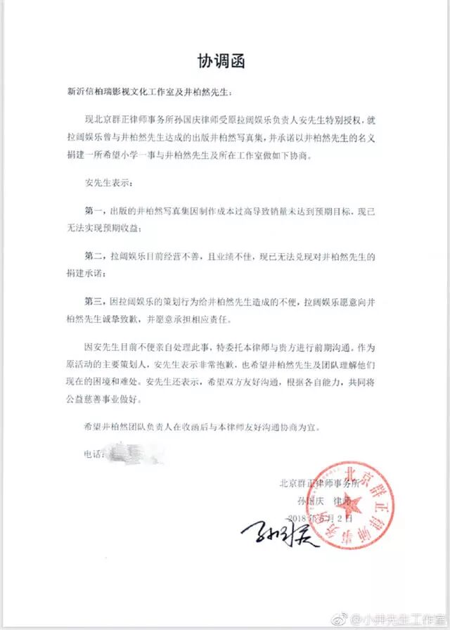 井柏然工作室晒出和拉阔娱乐的协调函,对方向井柏然道歉,并愿意承担相应责任。