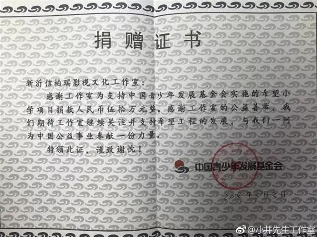 井柏然工作室5月3日晒出捐赠证书,捐赠50万元。但也说明井柏然之前承认捐赠,直到现在才兑现成功,属于拖捐。