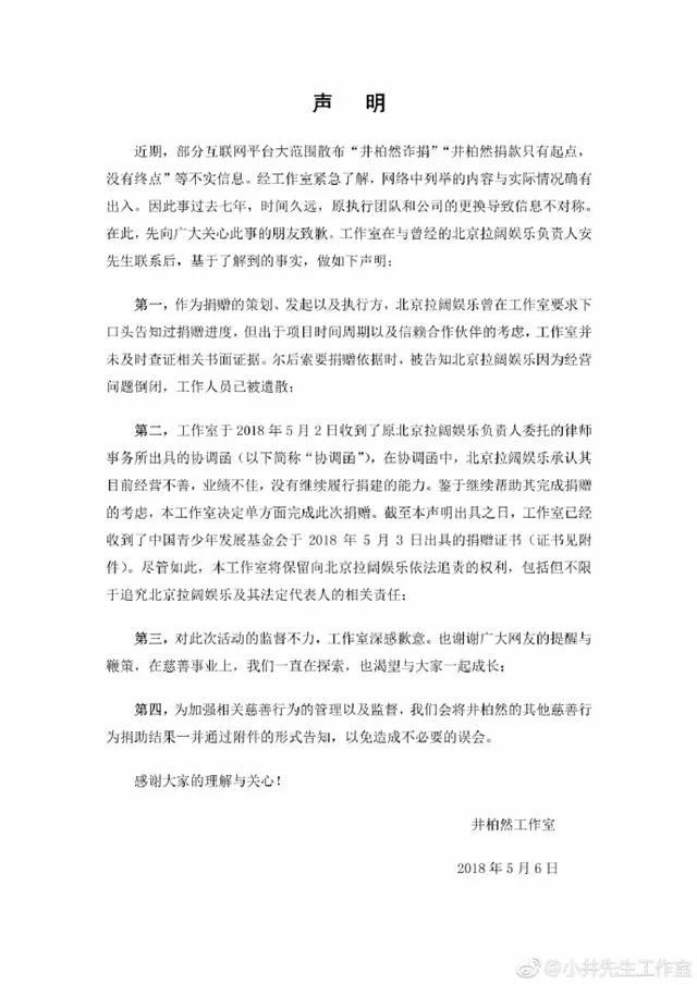 针对网友的质疑,5月6日,井柏然工作室发声明详细解释了这一事件的来龙去脉。