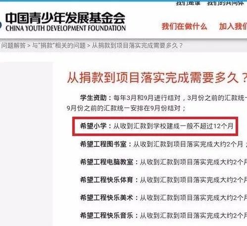 另外,根据中国青少年发展基金会的网站显示,这希望小学从捐款到项目落成,用时一般都不会超过1年。