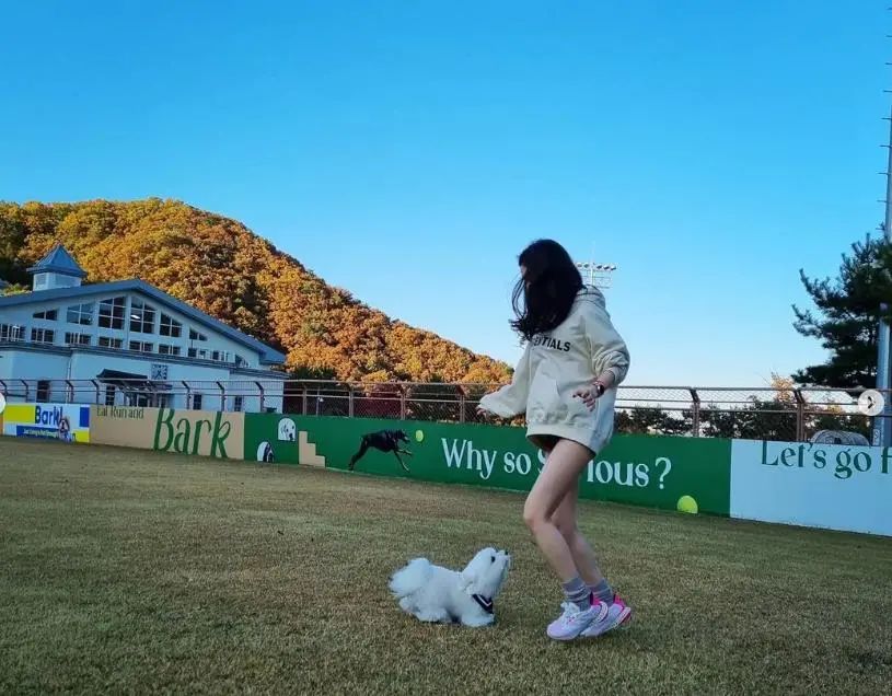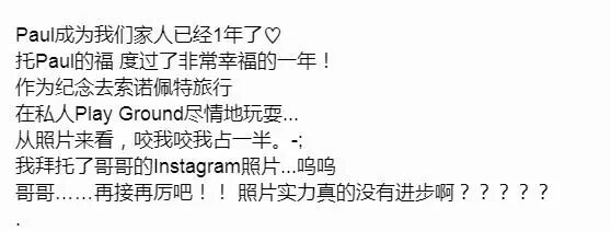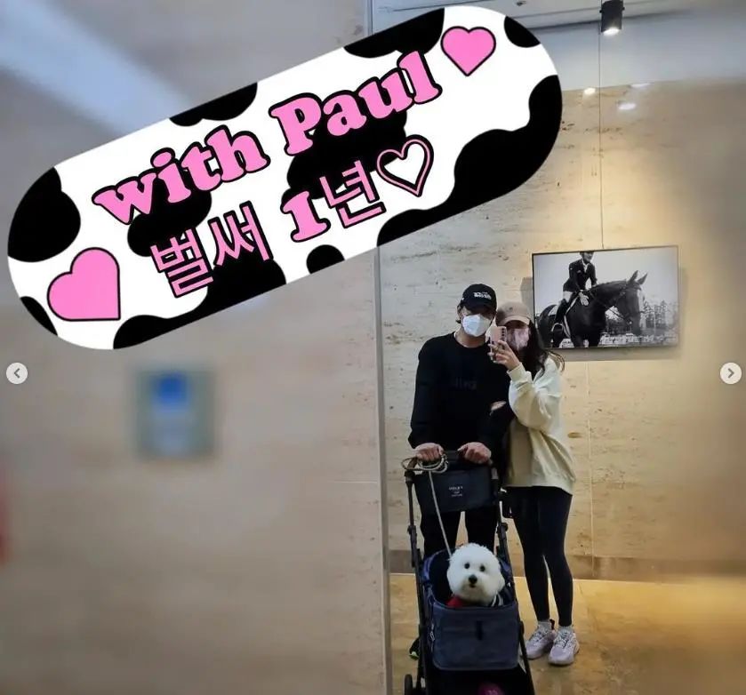 闵惠妍发布的文字内容更为生动,他喊老公为“欧巴”,机翻的内容不太准确,而闵惠妍的大概意思是说,他们养了小狗“Paul”一年,拖它的福,度过幸福的一年。之后又吐槽老公,说朱镇模的拍照技术没进步。