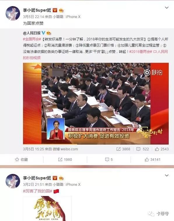 但根据某细心网友爆料,这几日的李小璐不单单只是在她本人的Ins社交平台上发文,还在自己的微博上频频发文,并在3月2日与5日两次微博发文试水,第一次用“厉害了,我的国”电影宣传照为主题来试水成功后,等到她第二次微博试水的时候,她终于自己在微博上发了这样五个字:“为国家点赞”!