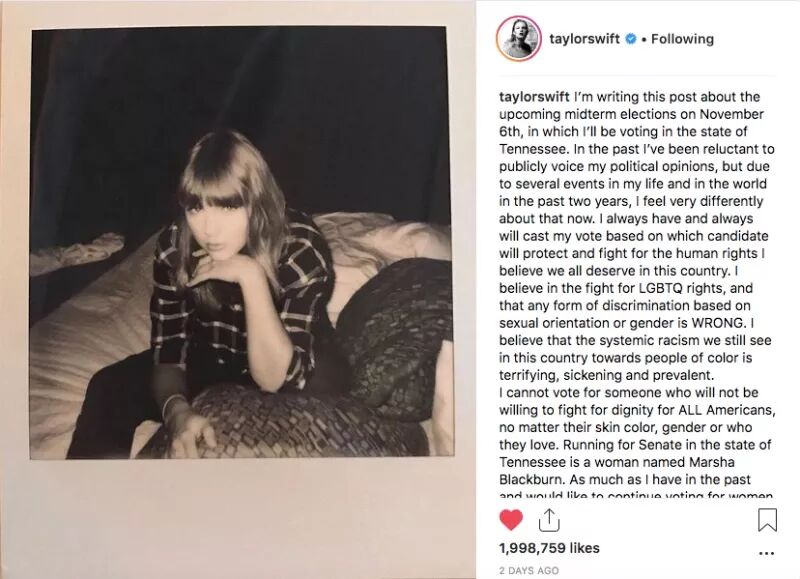 同时她还号召大家在马上到来的中期选举里参与投票,几天前她在 Instagram 上发表了自己职业生涯中的首个有关政治的观点,谴责了田纳西州共和党人 Marsha Blackburn,并呼吁性别、种族和人权平等。这条发文影响不小,已获得近 200 万的点赞(甚至包括水果姐),美国总统特朗普也做出了回应(虽然回应的也不是什么好话……)。