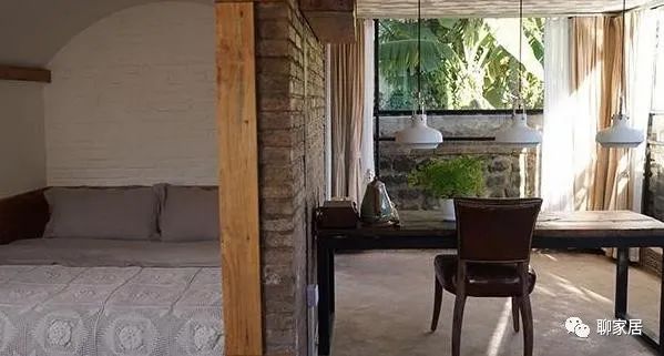 这样的卧室看起来非常的简朴,而且营造出了一种非常自然化的味道。简单的色彩搭配上复古石砖设计,整体都非常耐看,户外还有很大的休闲区,也是很大方得体。四周绿树环绕,阳光透过窗户看起来很唯美自然。