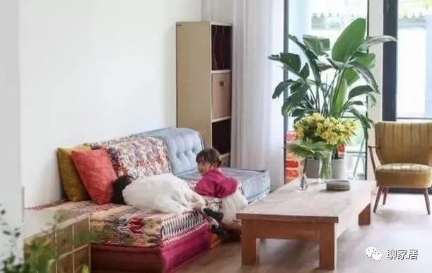客厅整体太小清新了,落地窗让屋子变成光线明亮又通透,大型的植物点缀的很有生活气息。家具用品都是非常简单普通的款式,而且都是用原木设计,健康环保又安全,搭配上这田园沙发也太文艺了!