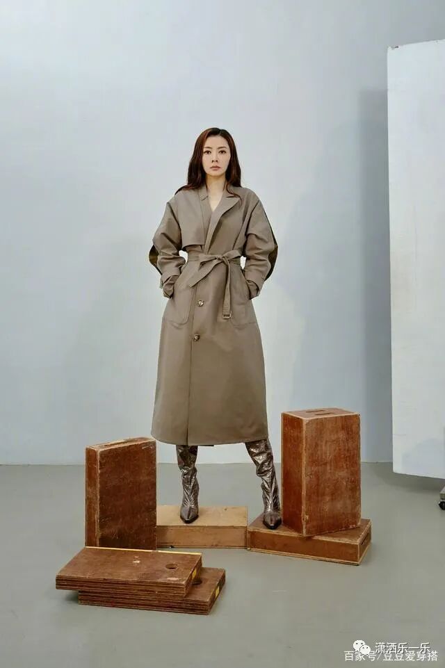 熊黛林的西装真漂亮又草率。浅棕色风衣使她看起来整洁干净。领口上的小V领设计使她的领口看起来更修长。腰带勾勒出她苗条的腰线。四肢加上披肩和长长的头发,为她增添了一点女人味,双脚上的枪色靴子使腿更长。