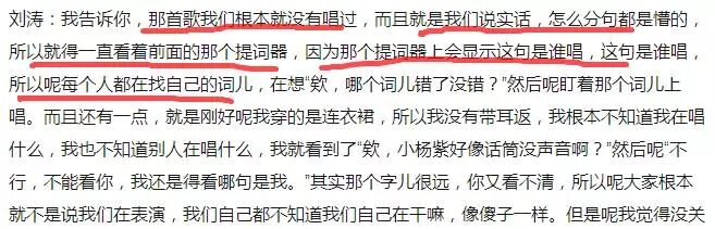 而刘涛再次澄清,说出了这次唱歌成车祸现场的原因,是因为唱歌没有事先彩排,唱歌分句都是懵的,要一直看前面的提词器,每个人都在找自己的词,刘涛还解释当晚自己穿连衣裙,没有戴耳返,所以不知道自己唱什么,也不知道别人唱什么。