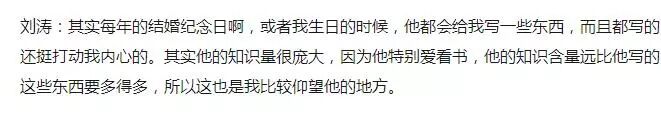 刘涛说,“每年结婚纪念日或者我生日的时候,他都会给我写一些东西,而且都写得还挺打动我内心的”,说起王珂时,语气里是藏不住的崇拜。