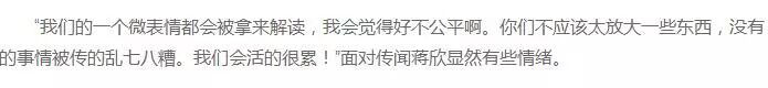 蒋欣此前说,“我们的一个微表情都会被拿来解读,我会觉得好不公平啊。你们不应该太放大一些东西,没有的事情被传得乱七八糟。我们会活得很累!”,以讹传讹,断章取义,这是很不公平的。她说五美感情很好,不是网上传的那样。
