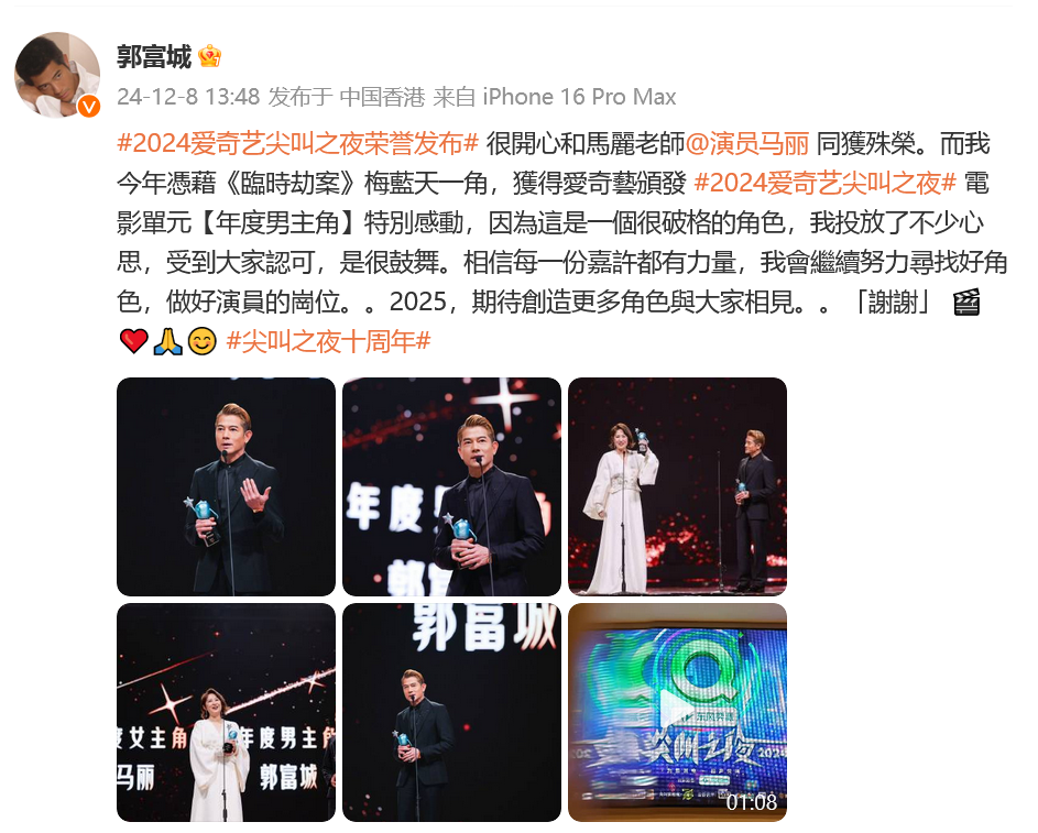 郭富城本人晒图回应:“很开心和马丽老师同获殊荣。而我今年凭借《临时劫案》梅蓝天一角,获得爱奇艺颁发2024爱奇艺尖叫之夜电影单元‘年度男主角’特别感动,因为这是一个很破格的角色,我投放了不少心思,受到大家认可,是很鼓舞。相信每一份嘉许都有力量,我会继续努力寻找好角色,做好演员的岗位。2025,期待创造更多角色与大家相见,谢谢。”