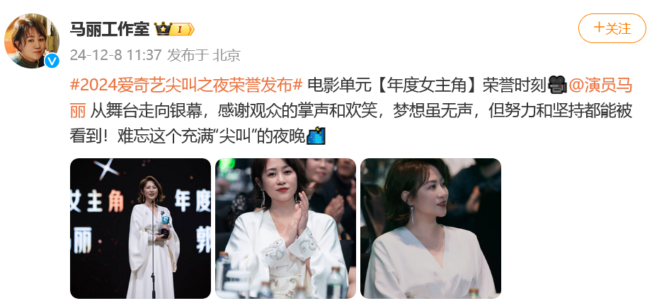 马丽工作室晒出其领奖图发文:“从舞台走向银幕,感谢观众的掌声和欢笑,梦想虽无声,但努力和坚持都能被看到!难忘这个充满‘尖叫’的夜晚。”