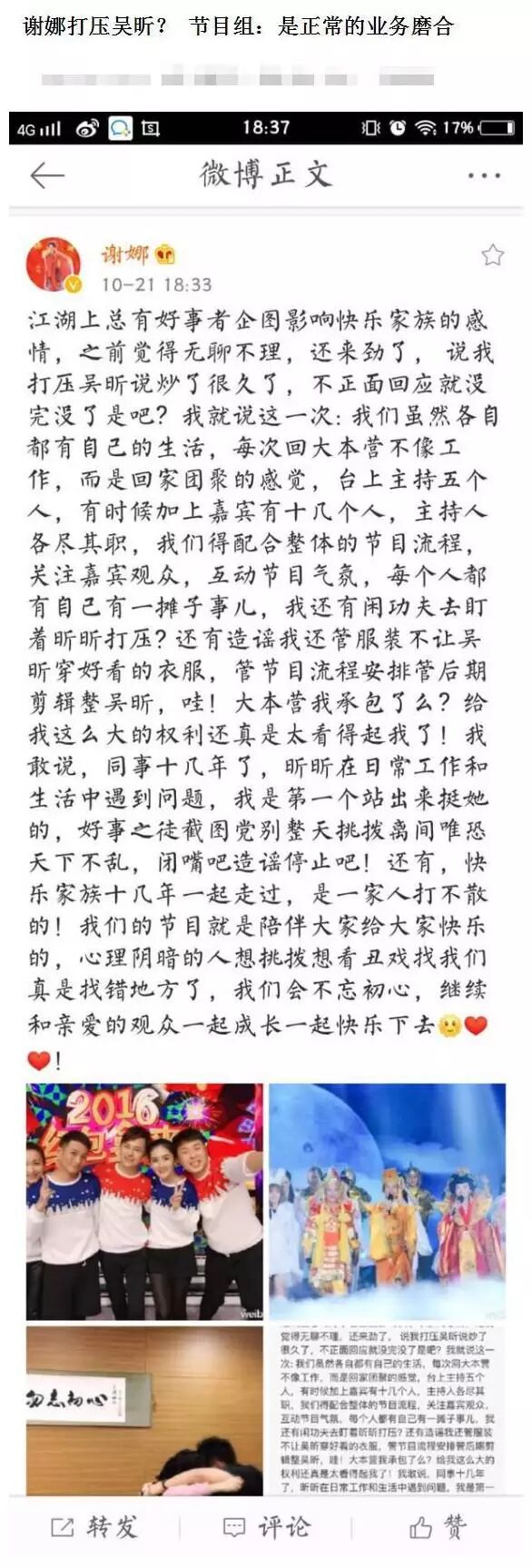 针对这一切的质疑,谢娜也出来解释什么,但是往事嚼烂之后,舆论又把矛头指向谢娜在快本上处处针对吴昕,打压吴昕,让吴昕一直只能默默的当绿叶,连出境的机会也少得可怜,几乎没有她插话的地方。以前不管别人怎么说,谢娜都可以当做没有发生一样,但是这一次可能触碰了谢娜的底线,她再也坐不住了,忍不住站出来澄清谣言。