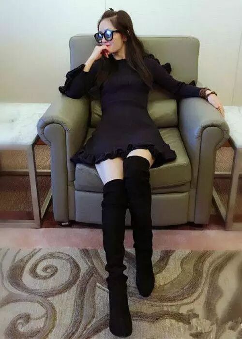 葛优躺啊,这一身荷叶边连衣裙,过膝靴露大腿,更显娜姐修长的美腿。