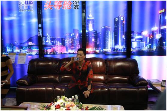 何家劲亲身体验芝华仕头等舱沙发的舒适度。