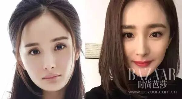 证人二杨幂,大幂幂也非常爱画一字眉,左图的她画了普通一字眉,倒也没什么奇怪,但是你往右边看,眉毛多了小尾巴,视觉上一下就瘦了有木有?