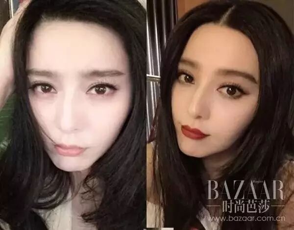 证人一范冰冰,她的脸虽然很瘦,但是明显没有右图脸轮廓显瘦,画了小尾巴款眉形可以很好地修饰眼角、颧骨处的脸型。