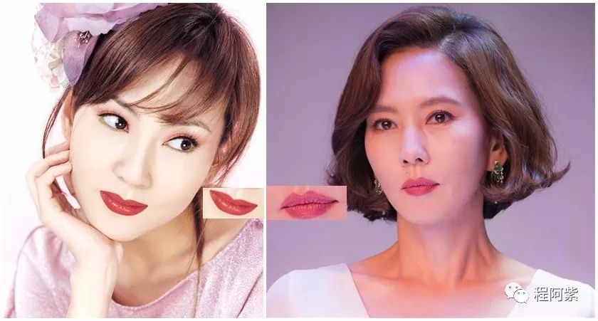 图一这种勾勒唇线再上口红的画法,显得优雅,图二是在《迷雾》她的唇妆,总是特意化的把口红轻轻的晕染出原本的唇形外,显得性感又野性。