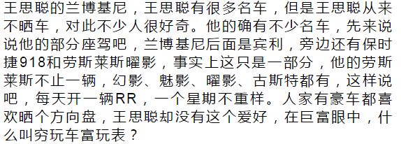 王思聪单手开劳斯莱斯,还不是自拍。中国有一句话叫穷玩车富玩表,无产阶级玩电脑,有些人玩车的确玩的很疯狂,法拉利,保时捷等豪车全有,豪车一排排,你能说穷吗?随随便便一辆车普通人要奋斗一生,而且未必能买起。其实穷和富是相对论,你要看和谁比较,在巨富眼中,穷玩车,富玩表,巨富玩游艇和大鸟,何为大鸟?当然是私人飞机了。