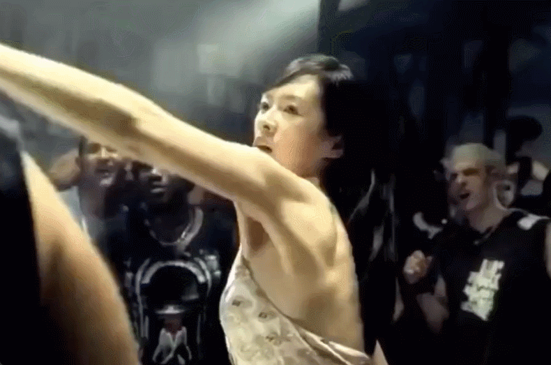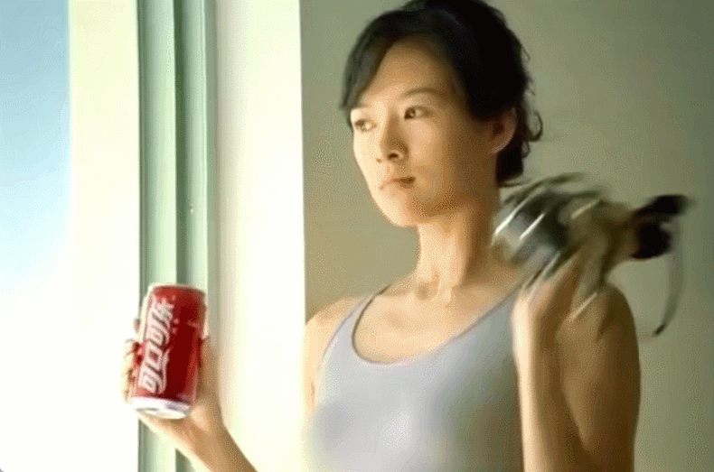 有意思的是,这广告拍了两个版本,和她搭档的男演员都莫名的惨,要么被扔进泳池,要么被她用中国功夫“打倒”。