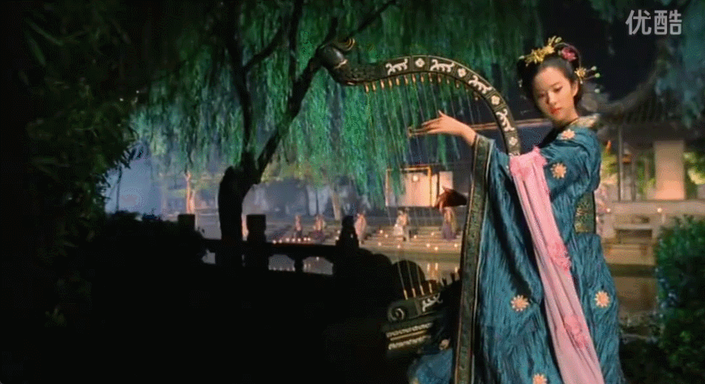 我最爱的是美人弹箜篌这组,身穿蓝色华服,立于湖畔,像极了从箜篌仕女图中走出来的工笔画美人。