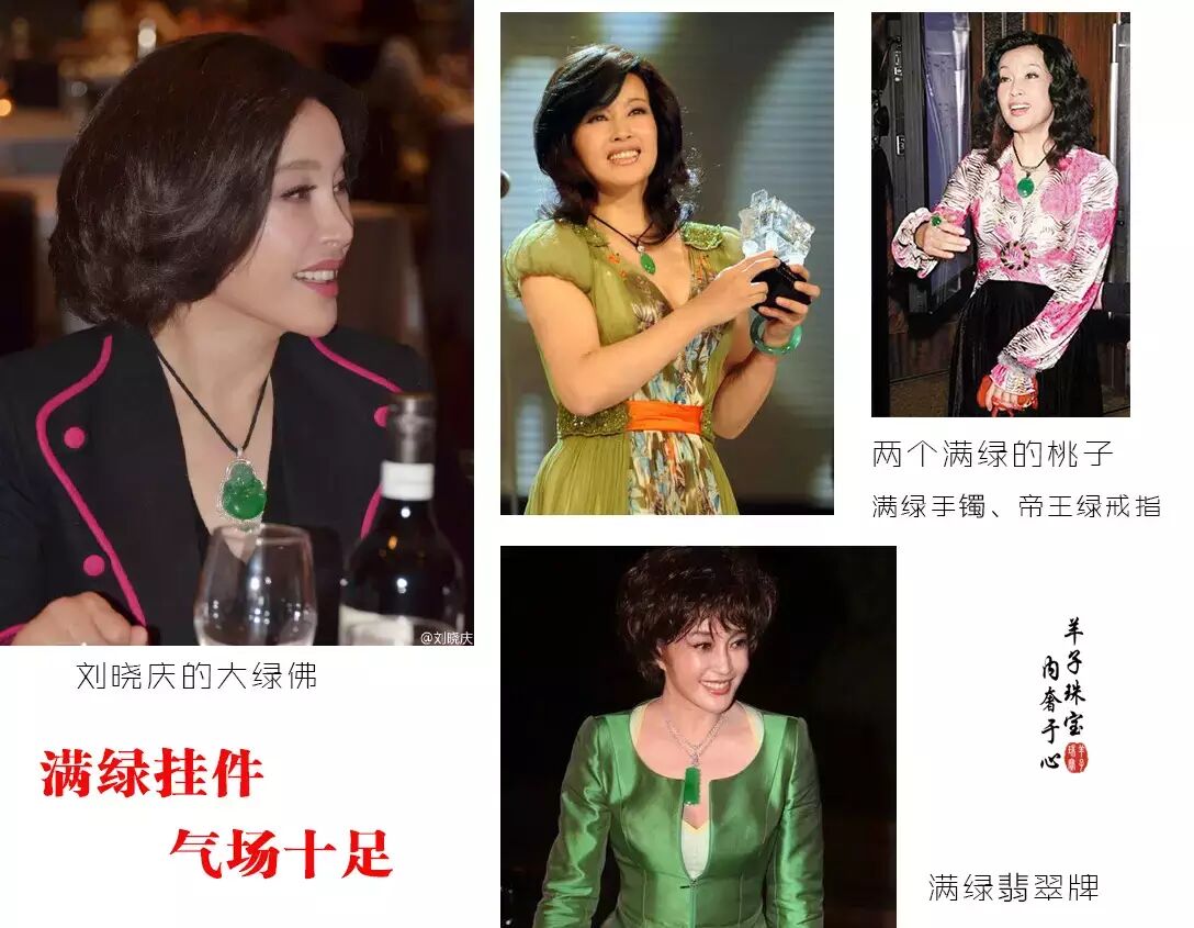 2014年刘晓庆参加刘嘉玲的生日宴会,戴的大的满绿件虽然种水稍差些,但气场十足!参加宴会绝对是视觉焦点!(说实话那么大的翡翠如果是玻璃种就是天价了……)