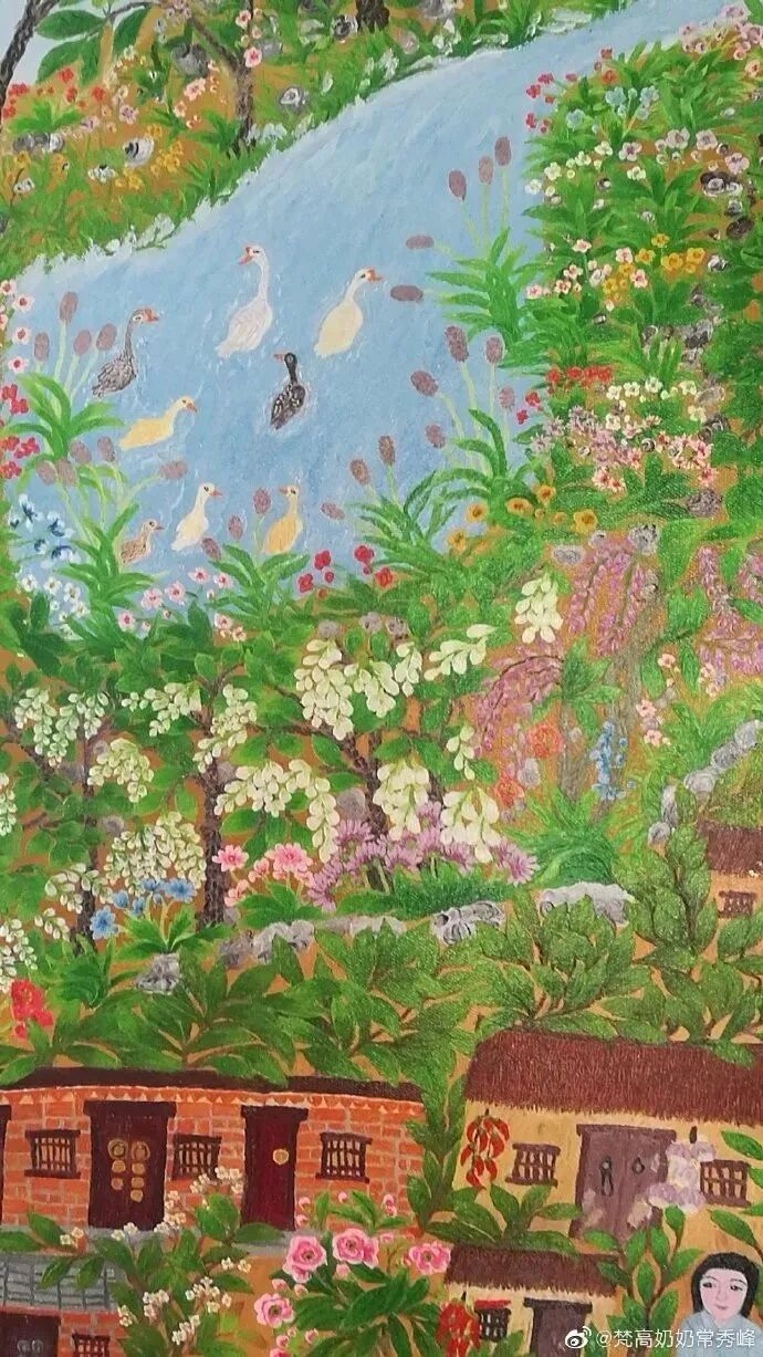 她画自己拉扯5个孩子长大的江家老屋,画金灿灿的向日葵,院子里的猫儿、天上的鸟儿,田里的花花草草;也画自己所能想到的一切生活、岁月里发生的故事、交集的人与情。