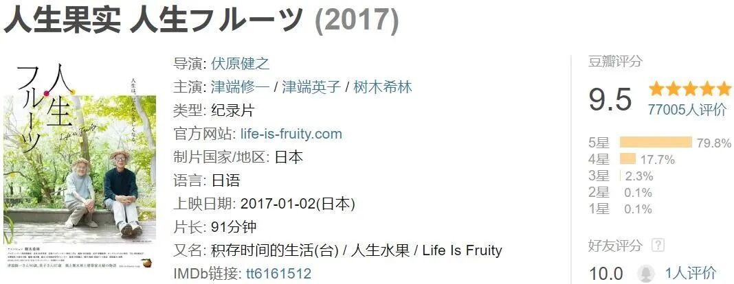 那个纪录片我看了几遍,每一次重温都回味良久。纪录片拍的很讲究,一年四季的静默记录,就如同两位老人传递而出的生活内涵:用时间等候泥土肥沃、生长出最好的果实。