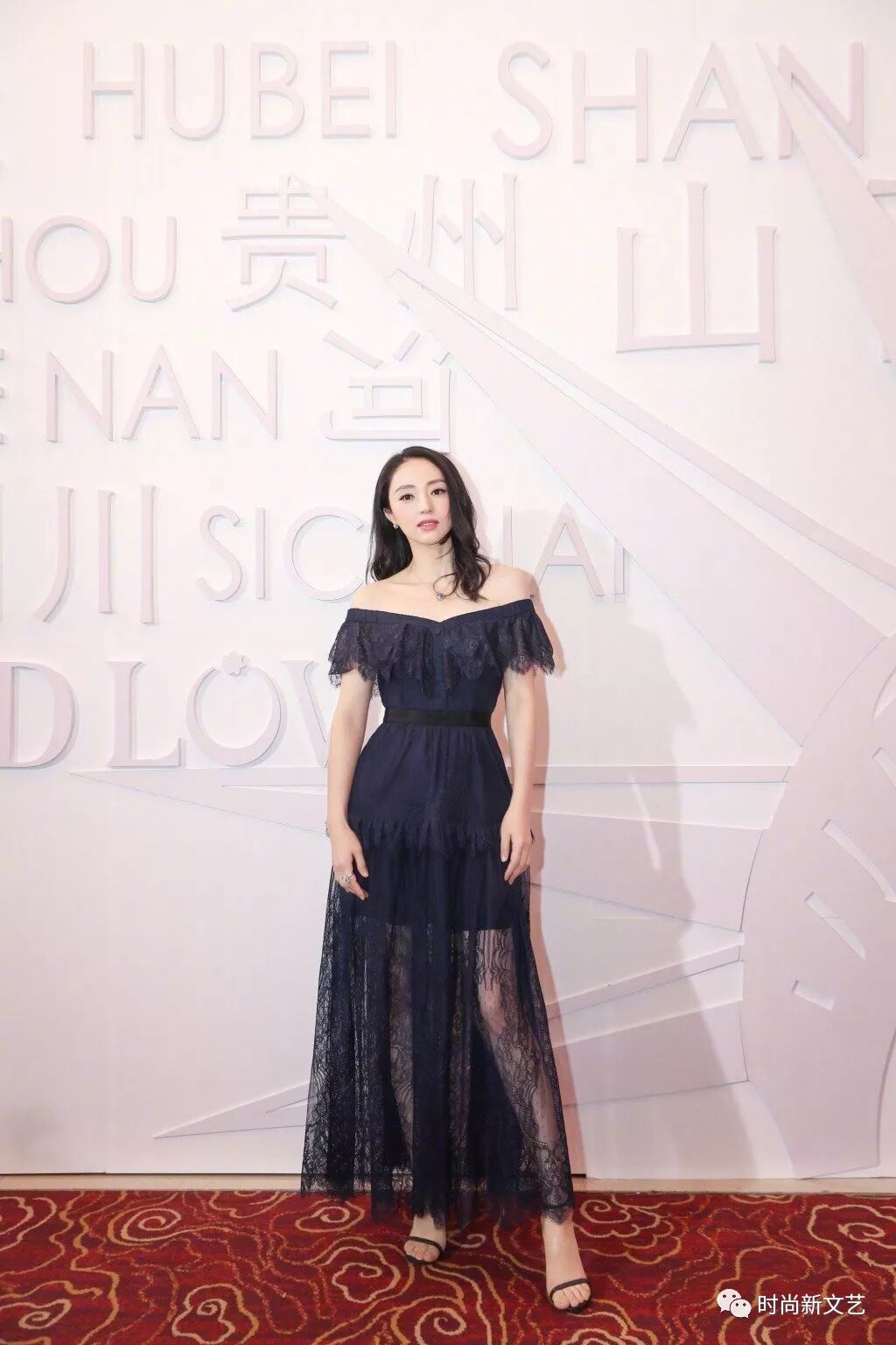 黑色一字肩礼服搭配黑色高跟鞋,十分性感,衬托的肤色更加白皙。裙子的腰线提的很高,显得身材比例也非常完美。裙摆黑色透视蕾丝有几分神秘感。