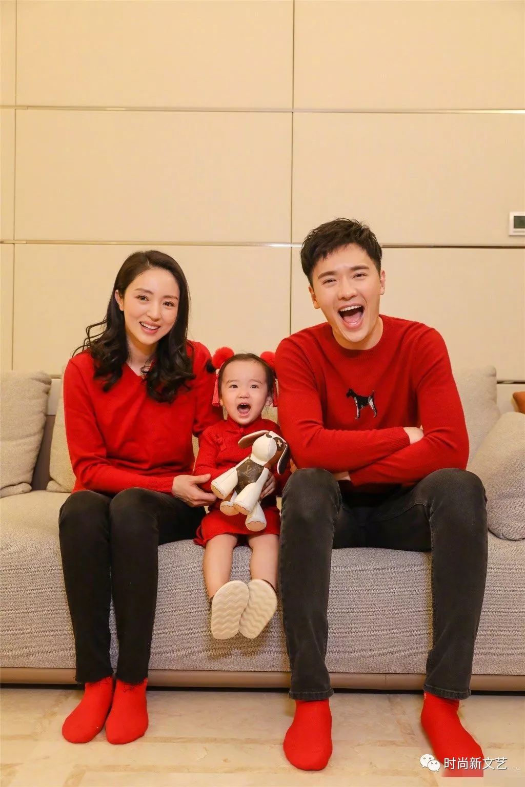 这张全家福也是超有爱的,董璇身穿红色针织毛衣搭配黑色长裤,配上红色长袜,一身穿搭十分喜庆。老公帅气,女儿可爱,真是超养眼啊!