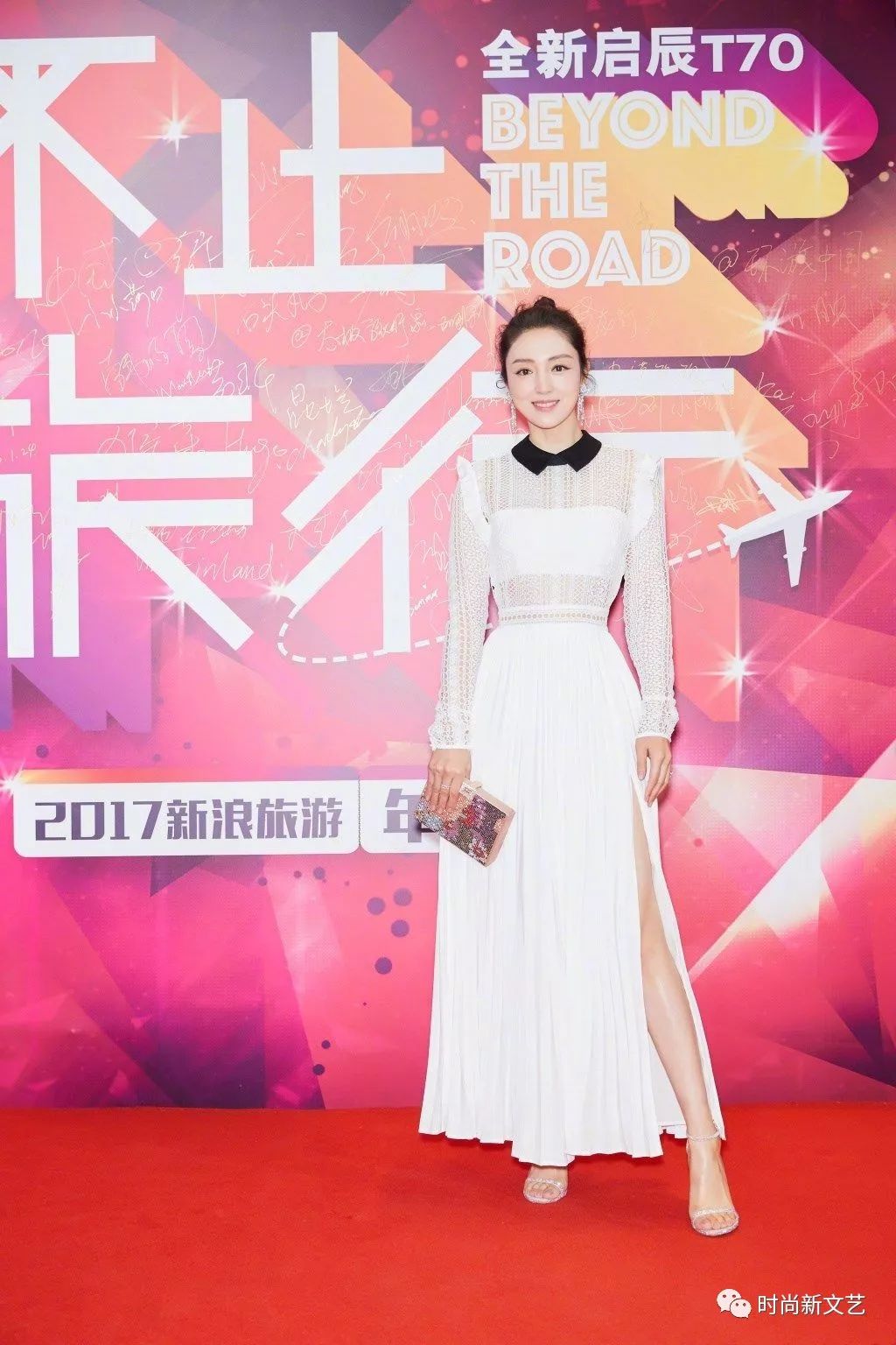 董璇身穿白色透视长裙,黑色娃娃领增添了几分亮点,而且还很显嫩。高开叉裙摆露出纤细的长腿,脚踩白色高跟鞋,站在红毯上,气质出众。