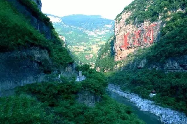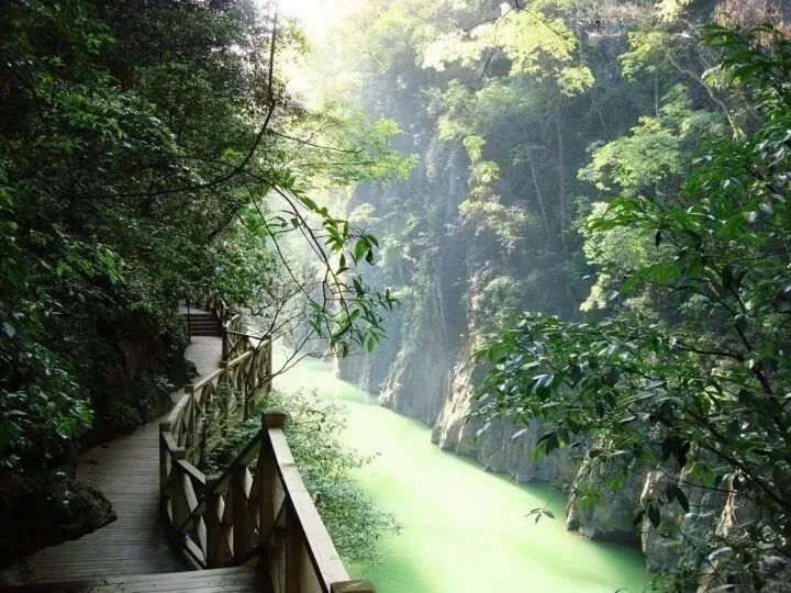 洋山河峡谷,幽深的峡谷勾勒出无山不洞、无洞不奇的美妙境界。这里的栈道在峡谷一侧的山上盘旋而上。