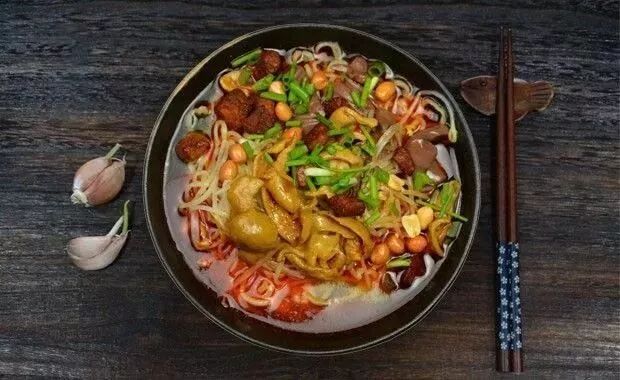 贵阳肠旺面以色、香、味"三绝"而著称,一份完整的肠旺面包含了富有弹性的鸡蛋面、鲜嫩的猪血、美味的肥肠……肠旺面红而不辣、油而不腻、脆而不生,简直就是人间美味。